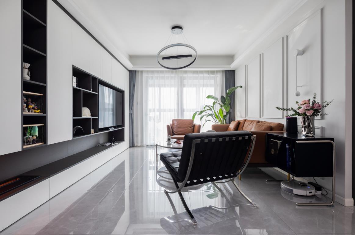 围合型的客厅布局,充分体现了会客的功能性。沙发边的实木悬浮书柜,不锈钢与深色木制相碰撞,打破了单一的沉闷感,储物、放书,收纳一切生活中的小美好。