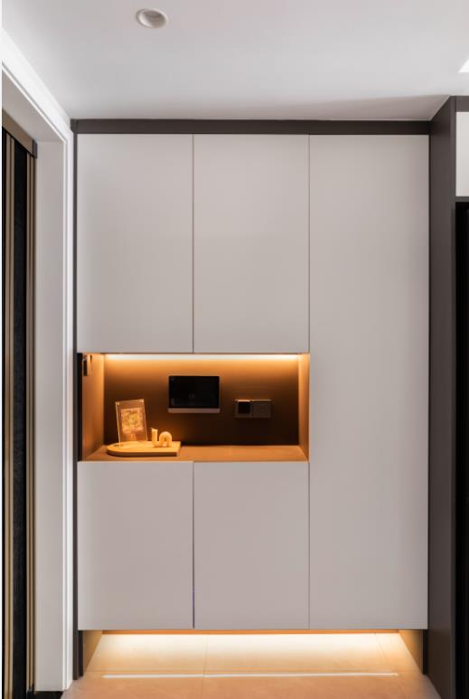 中间部分镂空方便置物,底部做20公分抬高用于日常鞋物收纳。内嵌灯光带,暖光营造氛围感也增加进屋艺术感。