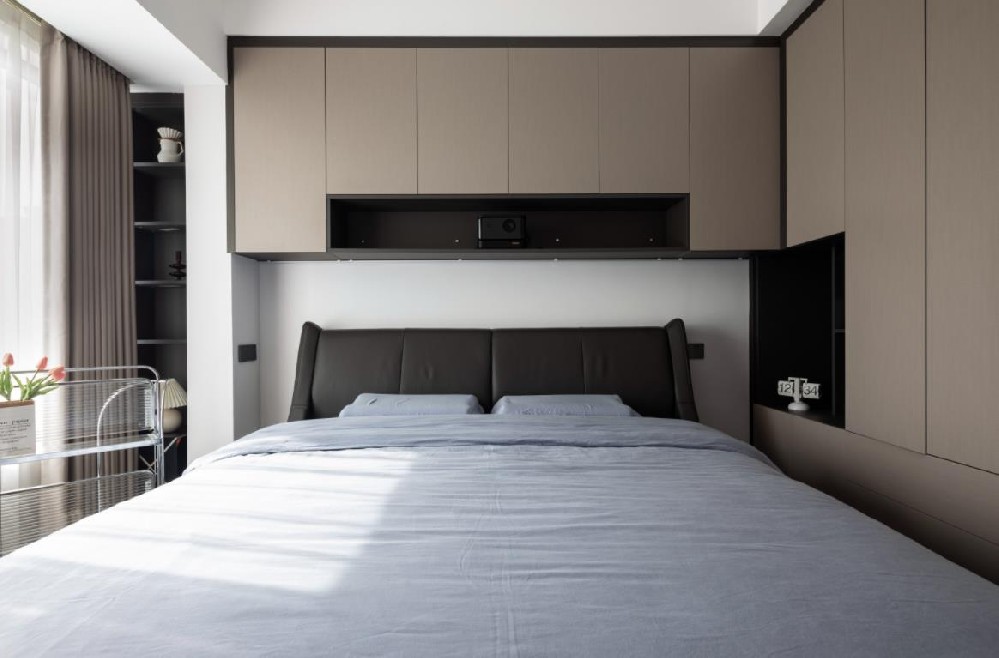 主卧设计装修定制柜由落地延伸至背景墙上柜,形成L型转角,实现超强收纳。抛弃传统的床头柜形式,改以方便移动的可折叠推车作为床头置物之处,实用的同时更添了几分休闲味道。