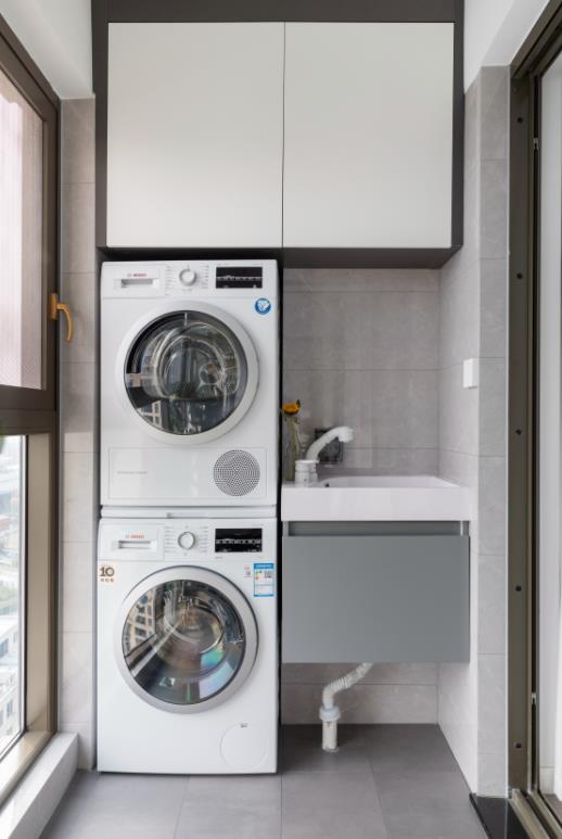 本案阳台面积较大,约8.5m²,总长达6.7m+。以30公分哑光地砖作平铺,灰色调简单且耐脏。